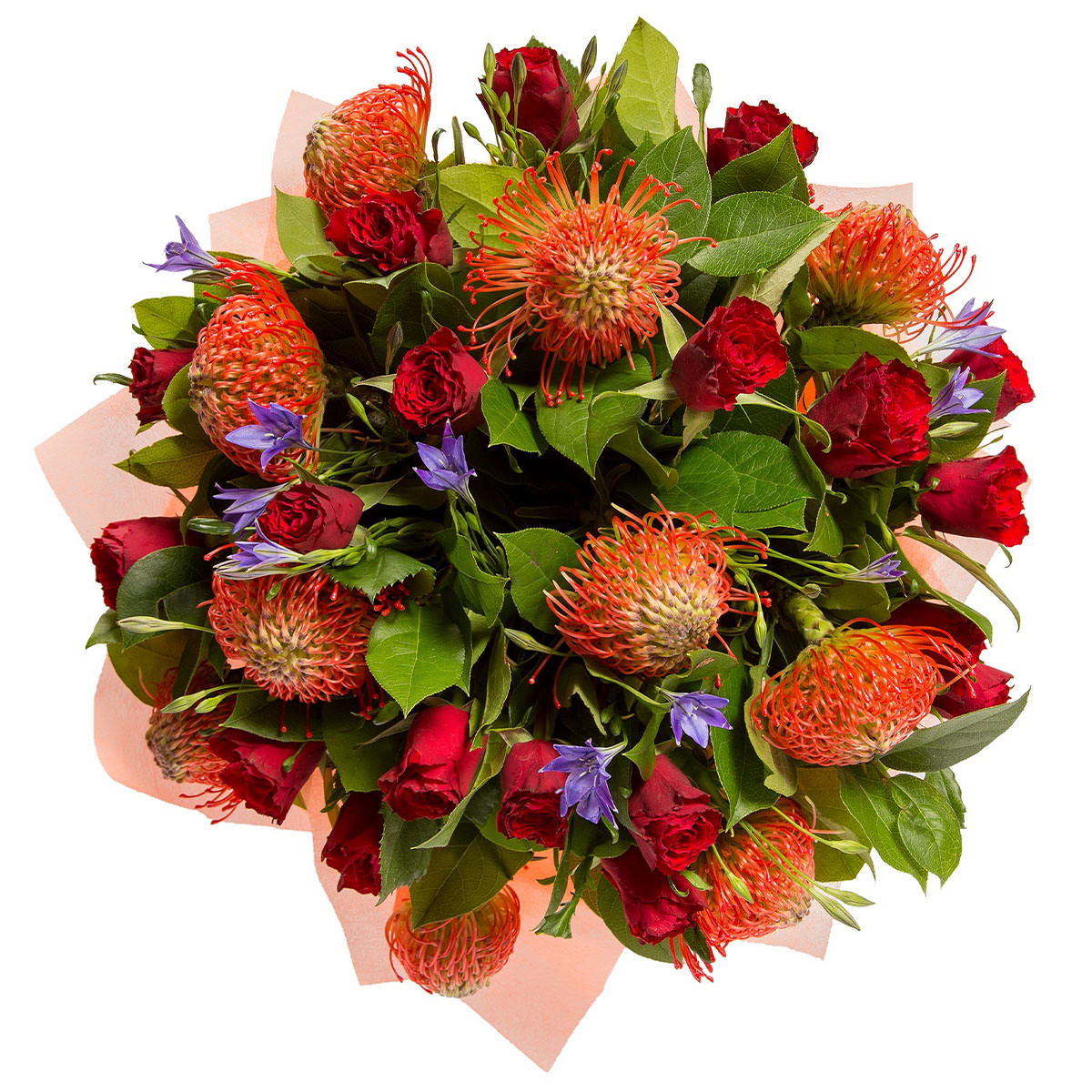 Роза кустовая красная, леукосперум (протея), колокольчик. Упаковка (лента, пленка, крафт, сетка, пленка матовая)