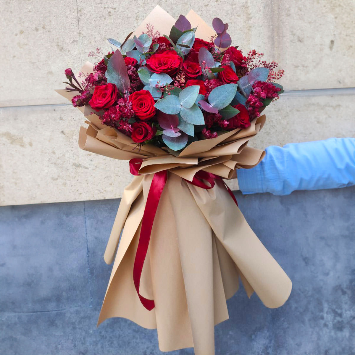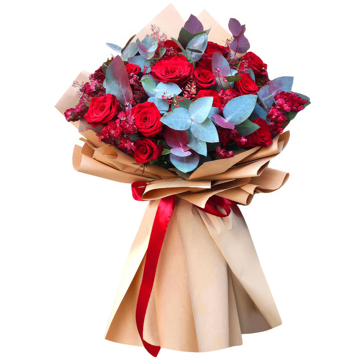 Роза кустовая красная, эвкалипт. Упаковка (лента, пленка, крафт, сетка, пленка матовая)