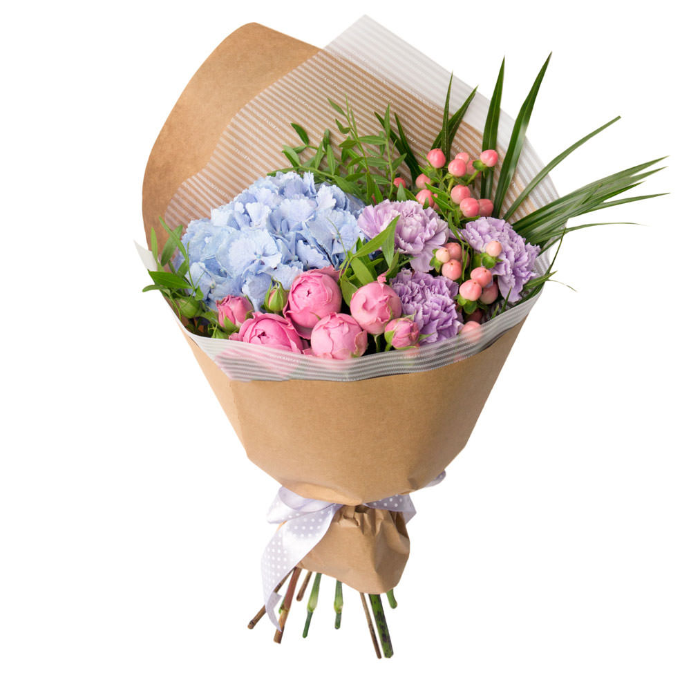 Гортензия голубая, роза пионовидная кустовая розовая, гиперикум, гвоздика сиреневая, фисташка, папоротник. Упаковка (лента, пленка, крафт, сетка, пленка матовая)