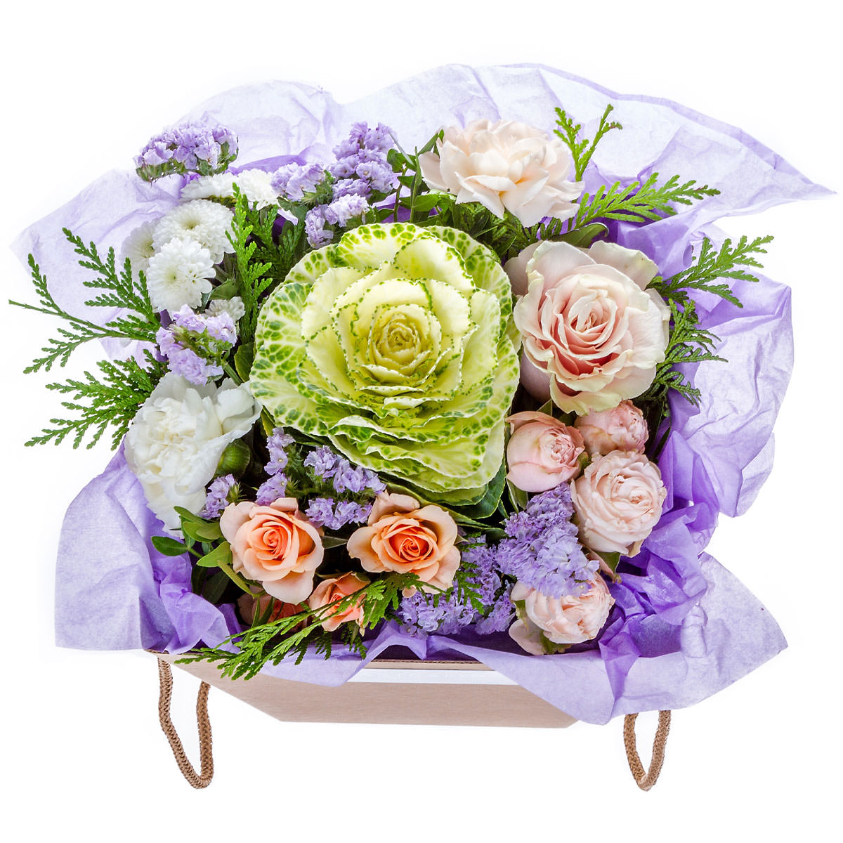 Декоративная капуста, роза кустовая персиковая, роза пионовидная розовая, гвоздика белая, статица сиреневая, туя. Упаковка (шляпная коробка, квадратный бокс, коробка сердце, оазис)